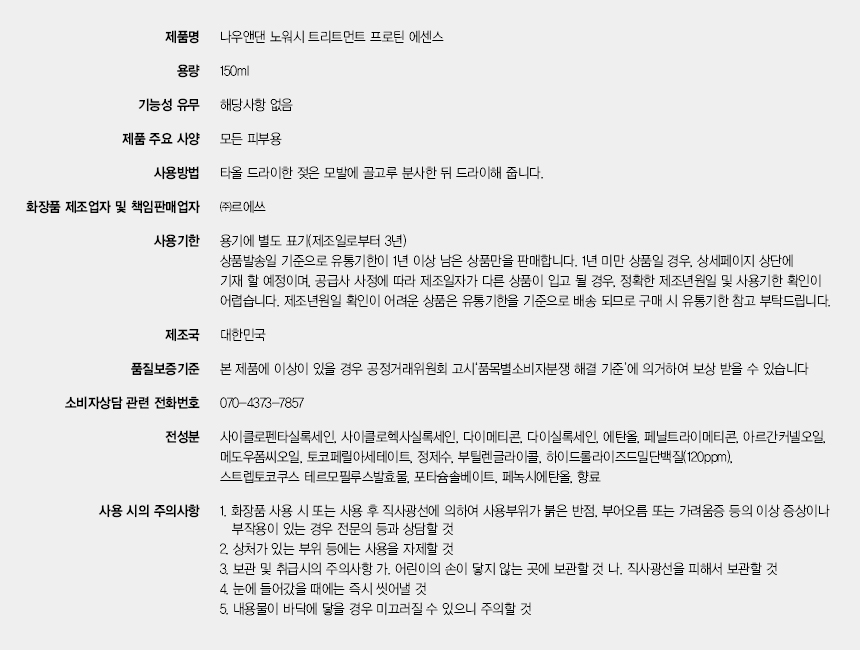 | 주요성분 | 사이클로펜타실록세인, 사이클로헥사실록세인, 다이메티콘, 다이실록세인, 에탄올, 페닐트라이메타콘, 아르간커넬오일, 메도우폼씨오일, 토코페릴아세테이트, 정제수, 부탈렌글라이클, 하이드롤라이즈드밀단백질(120pm) , 스트렙토코쿠스, 테르모필루스발표물, 포타슘솔베이트 , 페녹시에탄올 , 향료 |